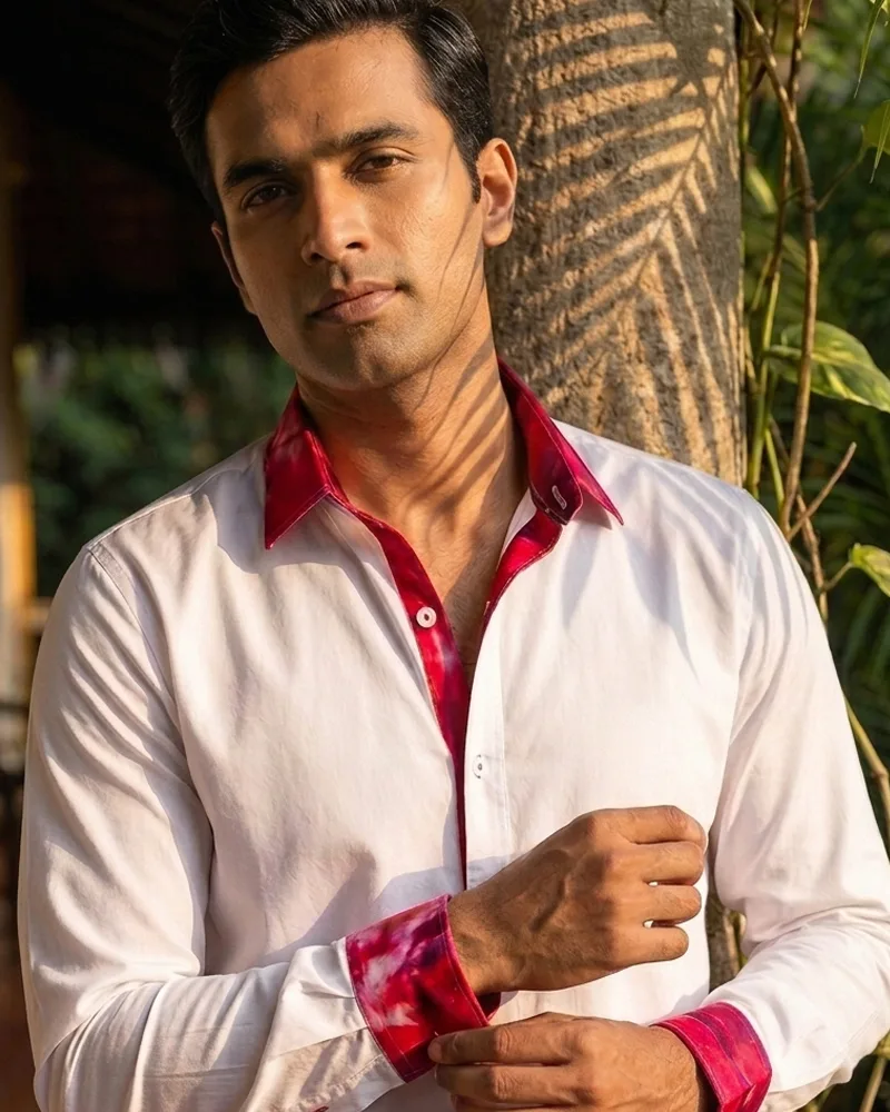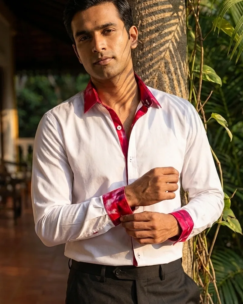 White Feather cotton shirt with patterned button patti and colored collar for a casually smarter appeal, fashion flex…