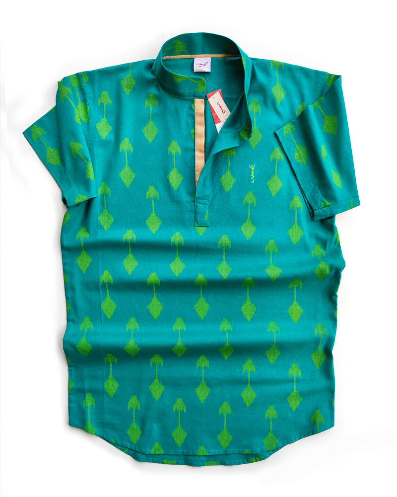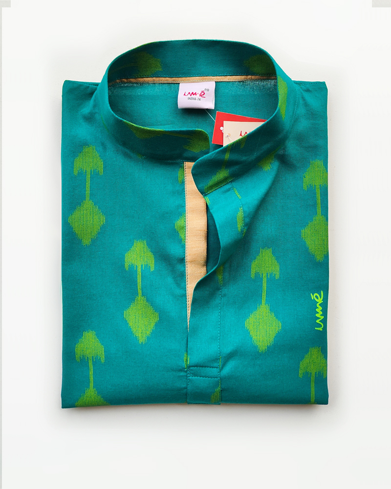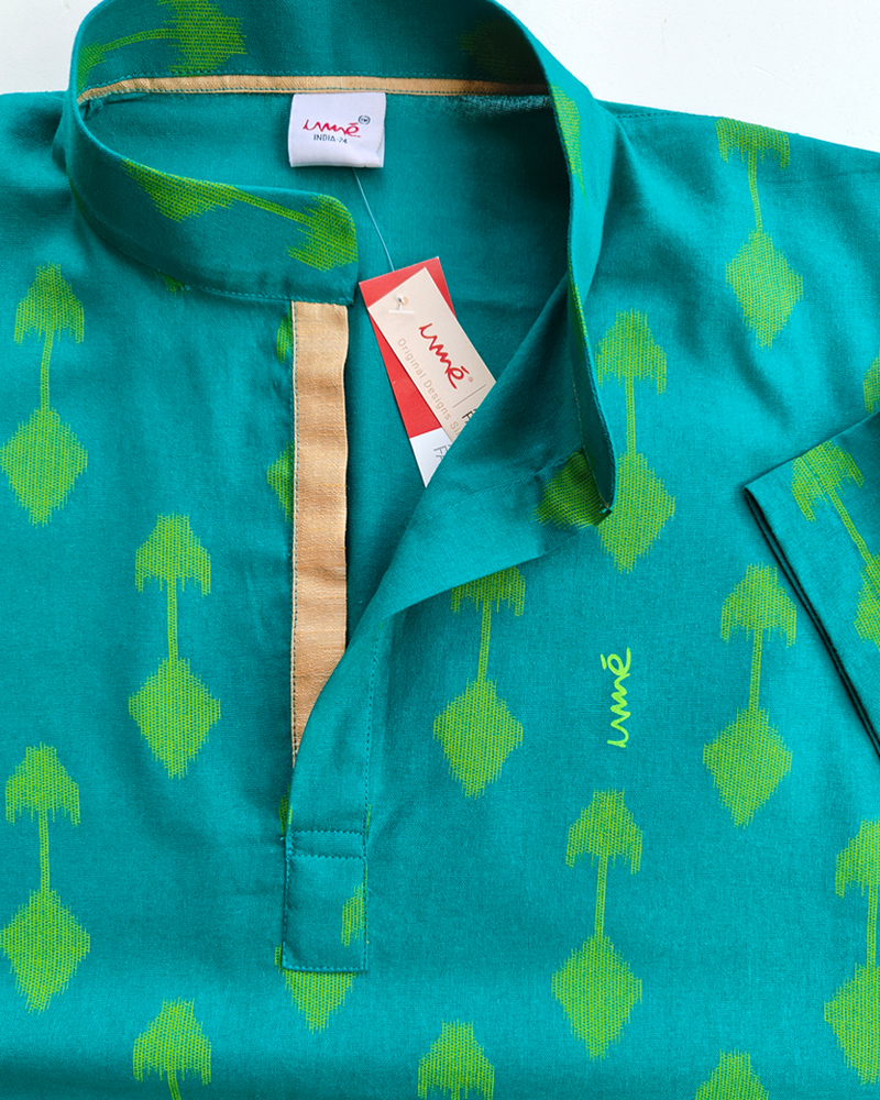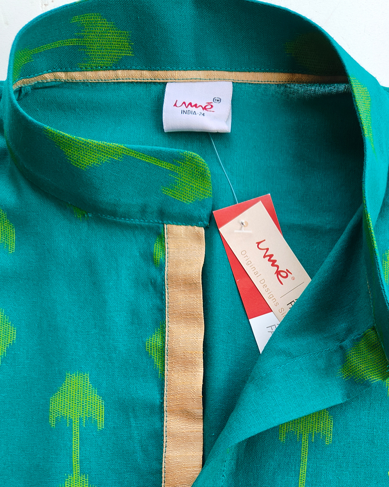 “Add a dash of festive flair to your wardrobe with our stunning green-gold ikkat fabric kurta! What makes it truly one-of-a-kind is the unique blend of colors that can only be found at Team Ume. Get ready to turn heads and make a statement this festive season!”